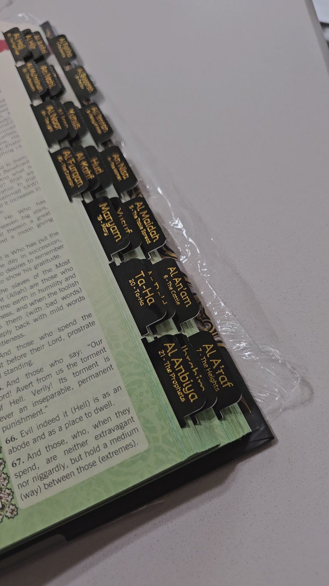 Once the tabs are in place, you can effortlessly flip to the desired section without having to search manually through the pages. This organization not only facilitates easier navigation but also enhances your memorization and study, helping you deepen your understanding of the Quran.